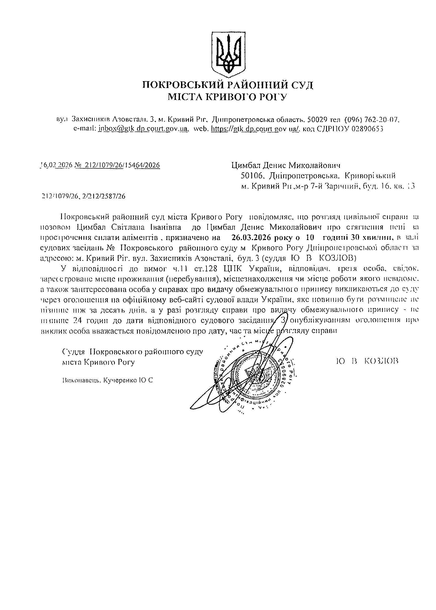 Оголошення про виклик до суду Цимбала Дениса Миколайовича