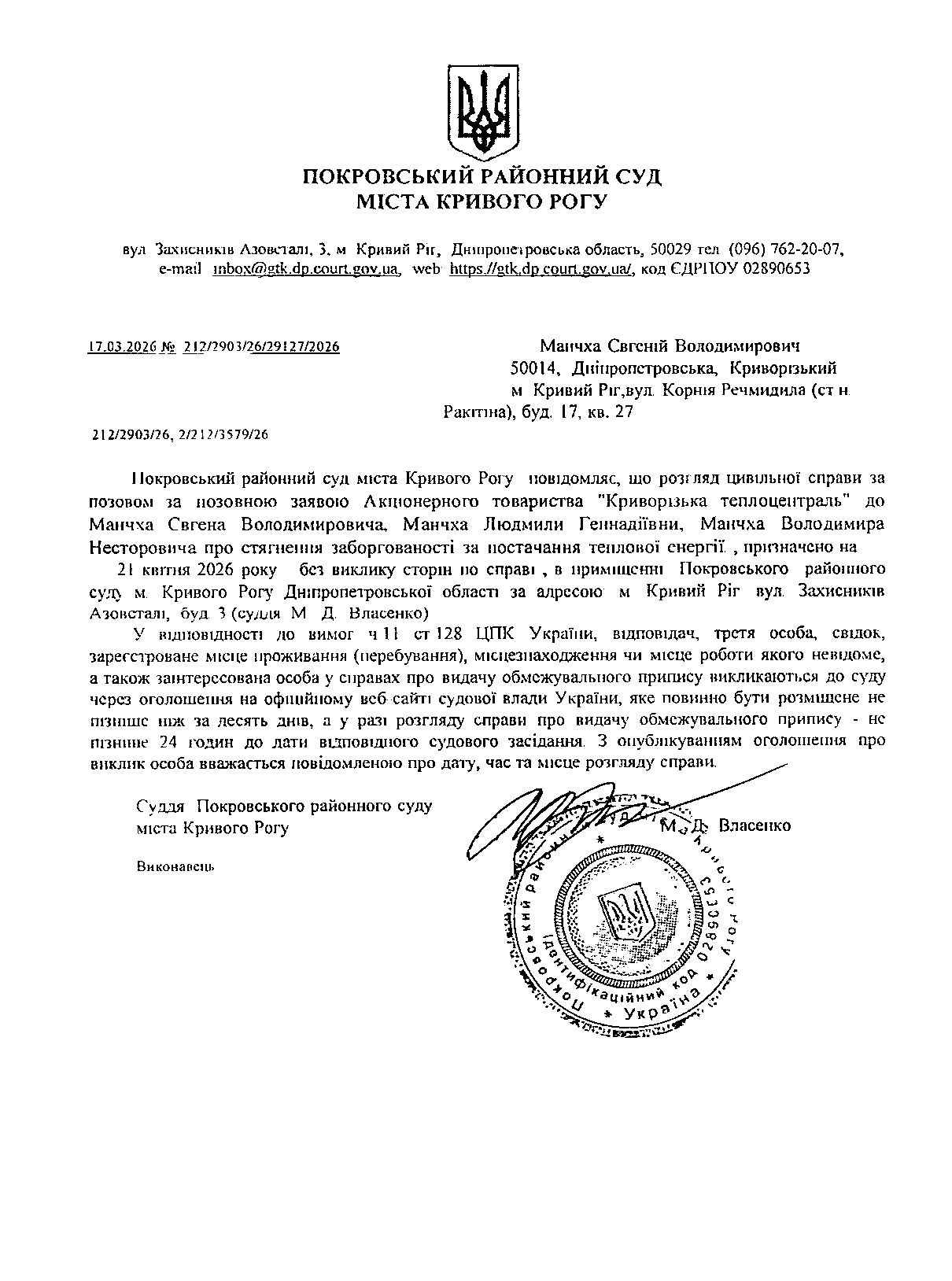 Оголошення про виклик до суду Манчхи Євгенія Володимировича