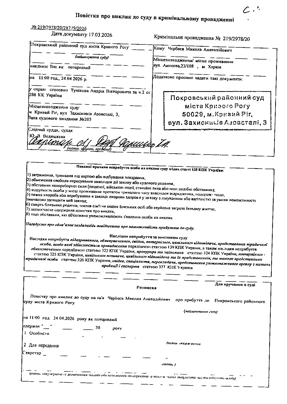 Оголошення про виклик до суду Чербаєва Миколи Анатолійовича