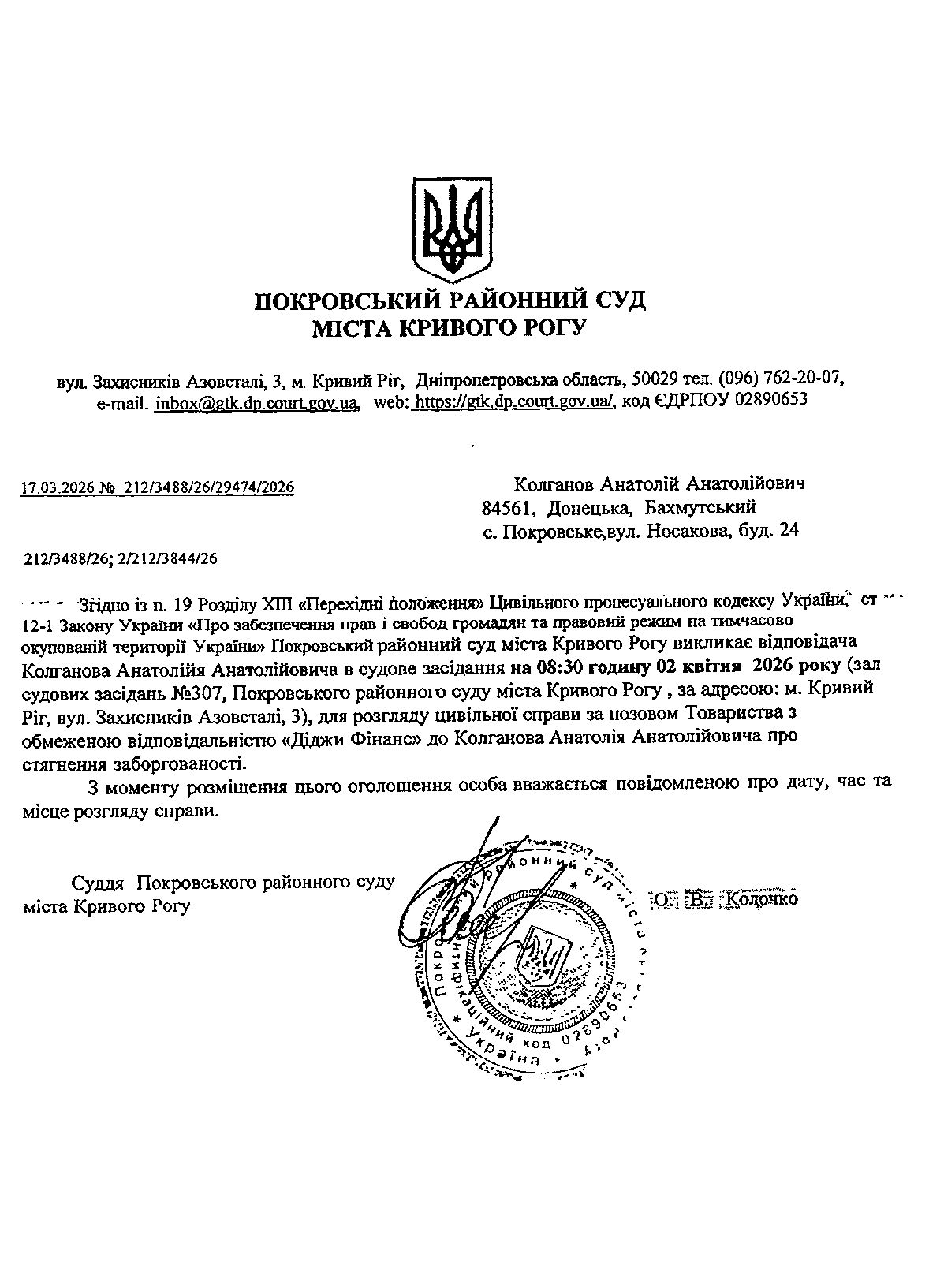 Оголошення про виклик до суду Колганова Анатолія Анатолійовича