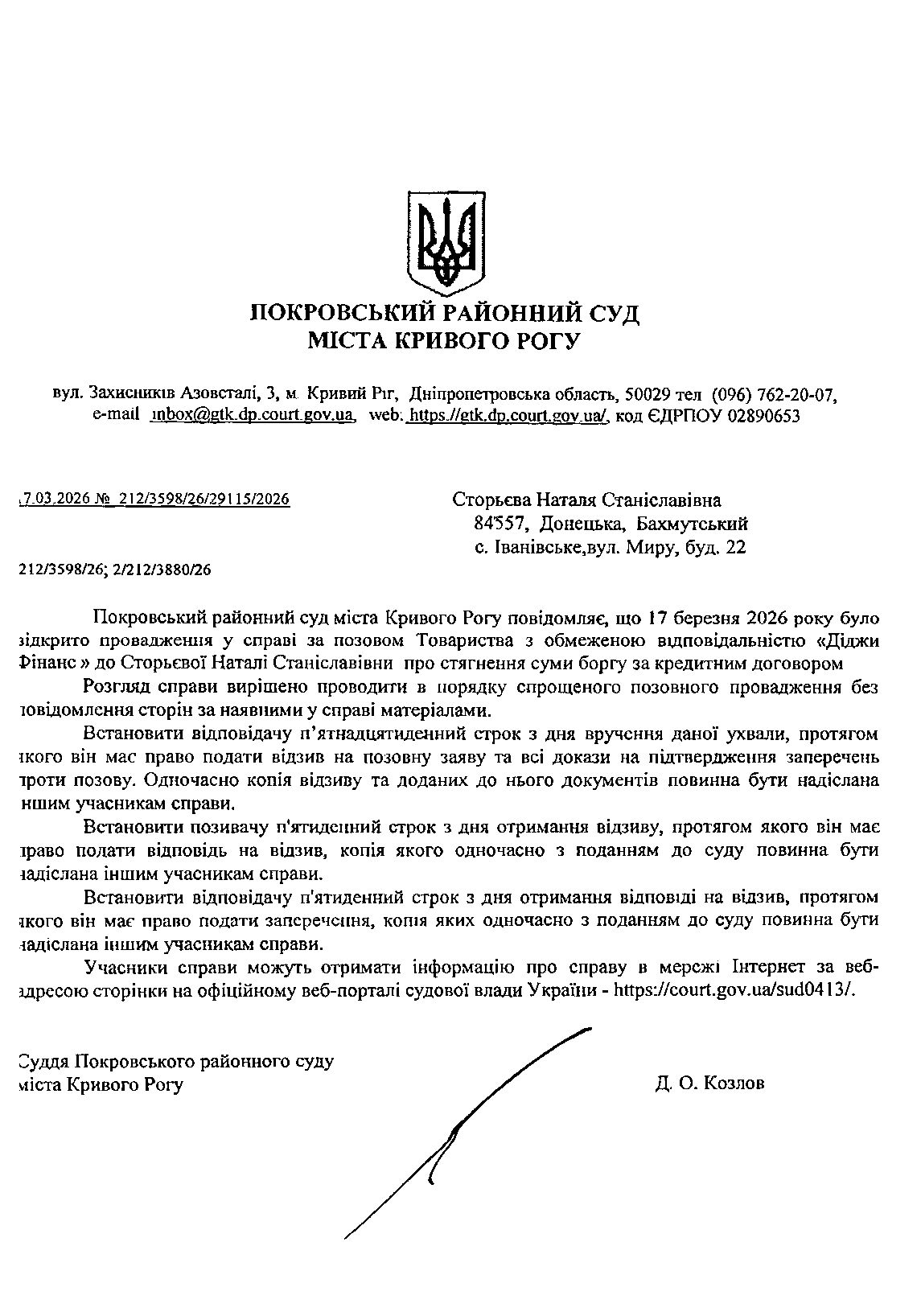 Оголошення про виклик до суду Сторьєвої Наталі Станіславовни
