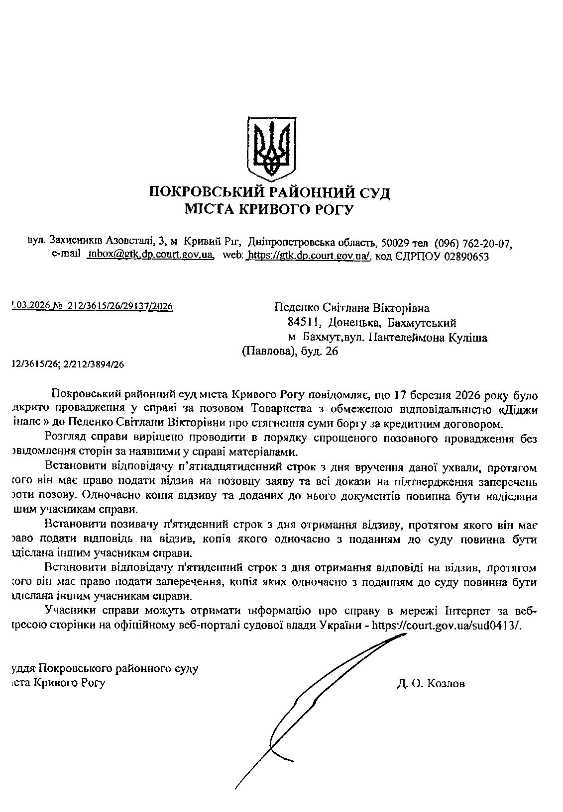 Оголошення про виклик до суду Педенко Світлани Вікторівни