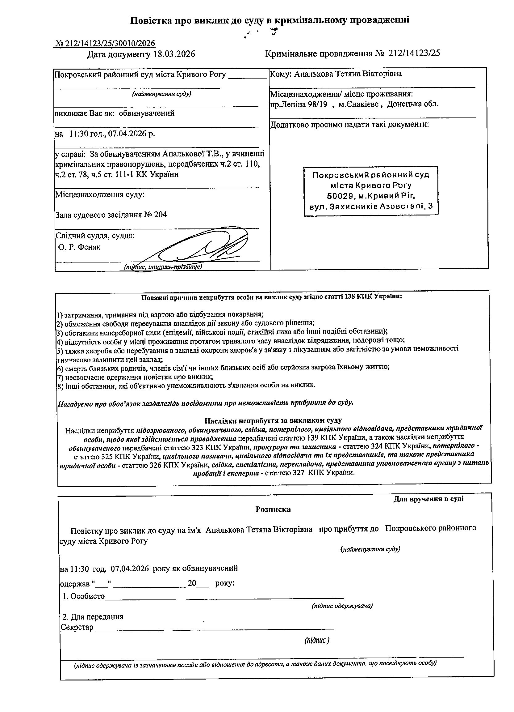 Оголошення про виклик до суду Апалькової Тетяни Вікторівни