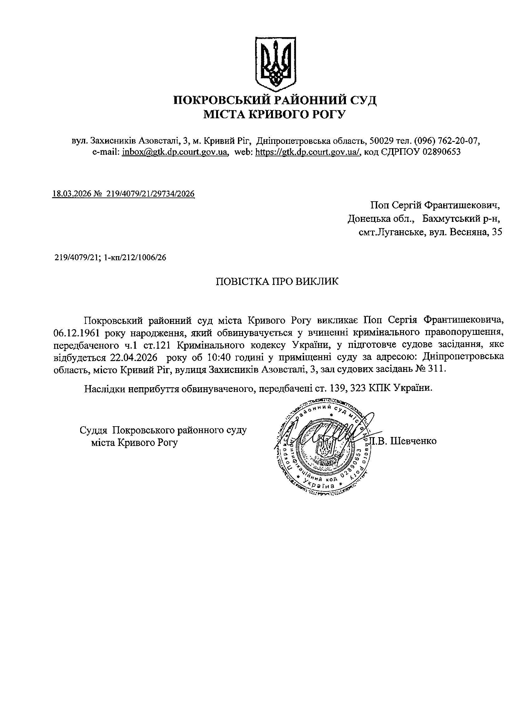 Оголошення про виклик до суду Попа Сергія Франтишековича