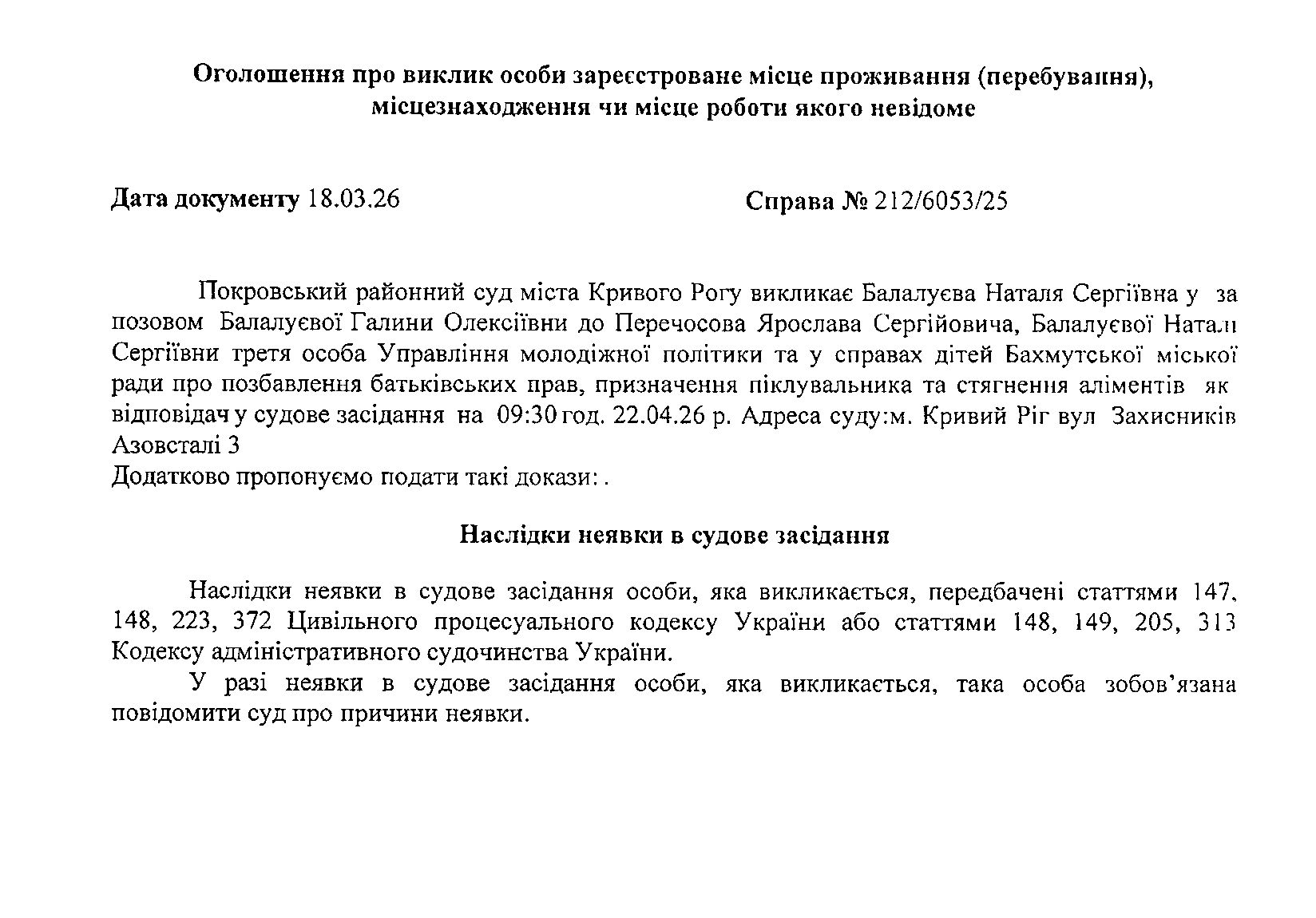 Оголошення про виклик до суду Балалуєвої Наталі Сергіївни