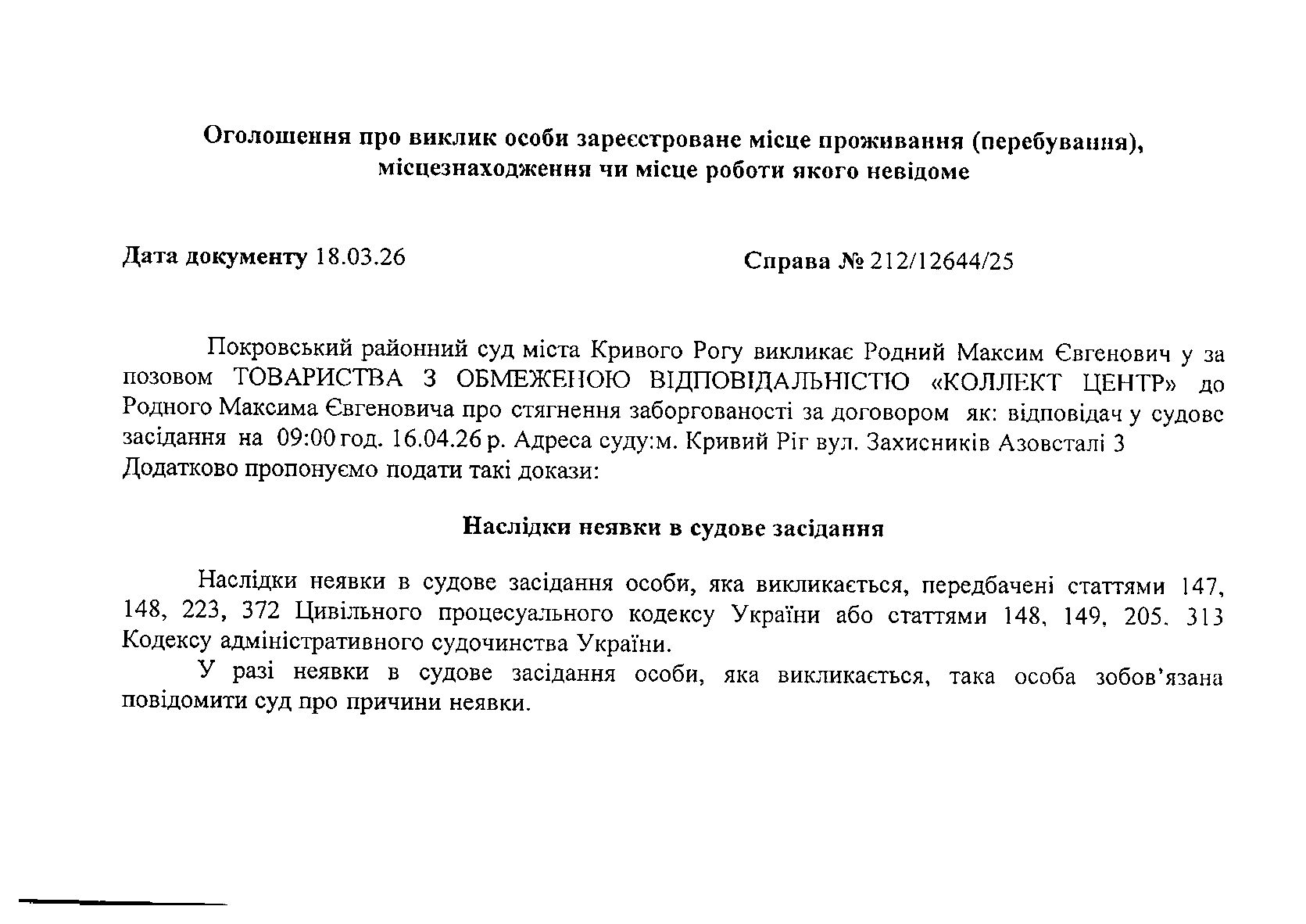 Оголошення про виклик до суду Родного Максима Євгеновича