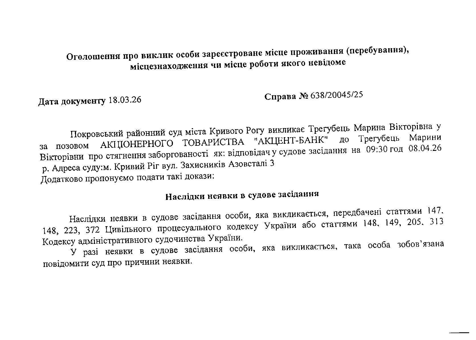 Оголошення про виклик до суду Трегубець Марини Вікторівни