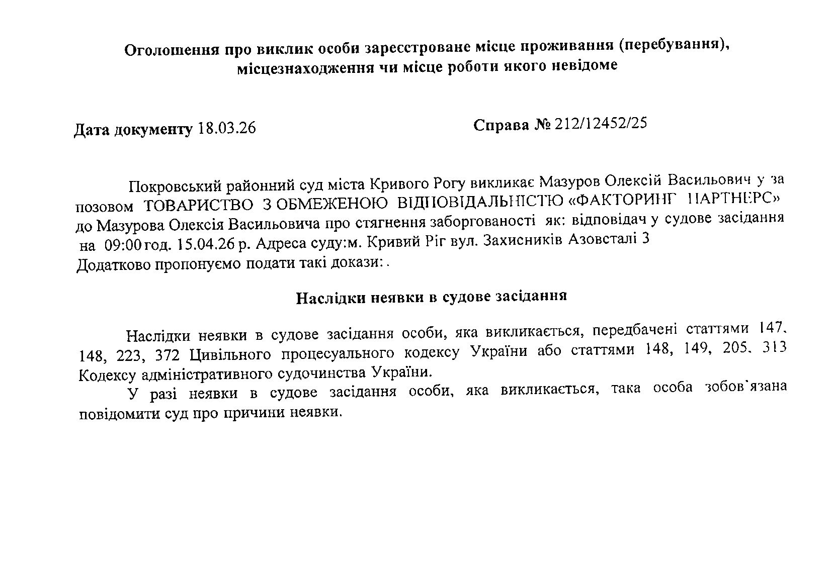 Оголошення про виклик до суду Мазурова Олексія Васильовича