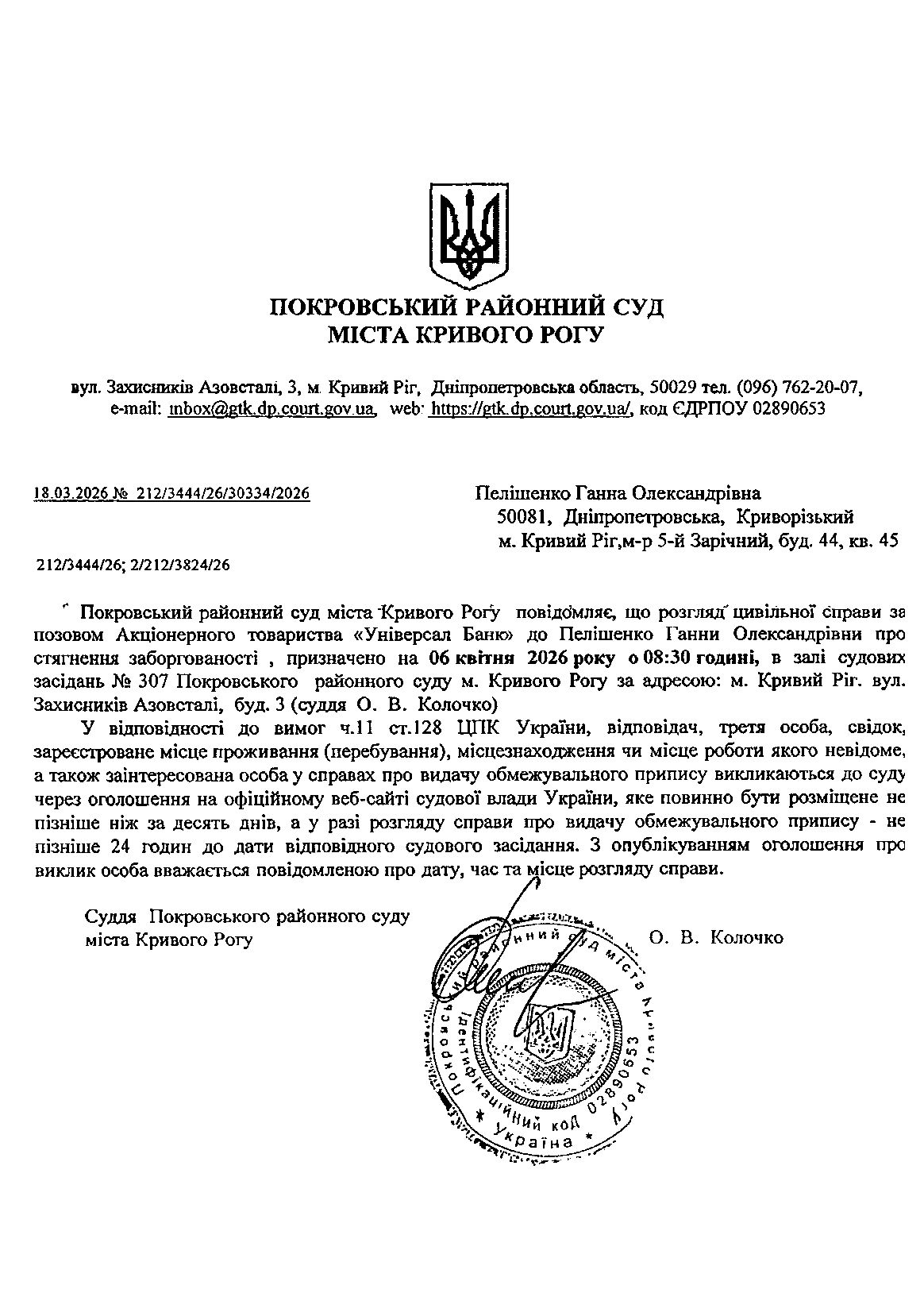 Оголошення про виклик до суду Пелішенко Ганни Олександрівни