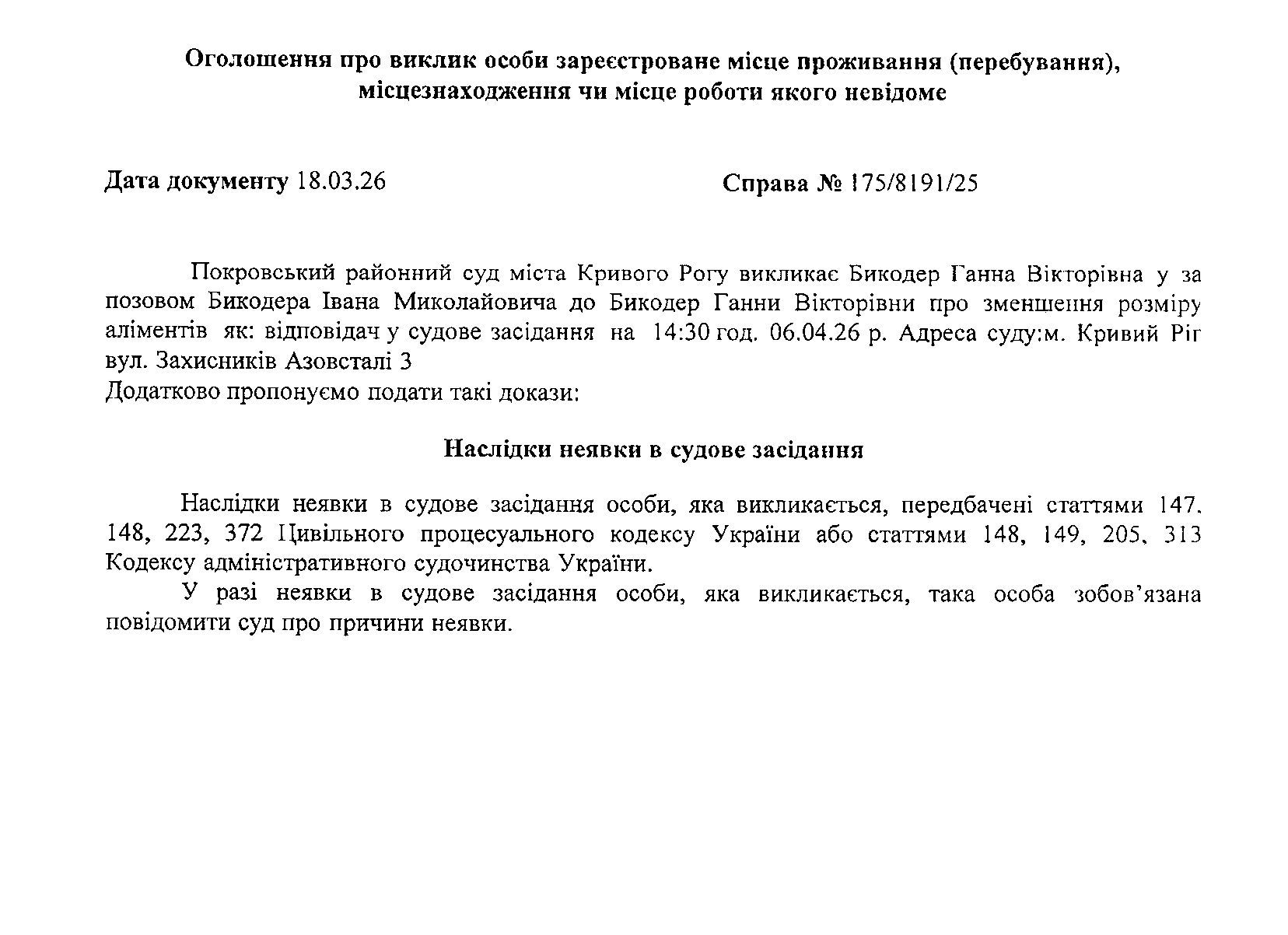 Оголошення про виклик до суду Бикодер Ганни Вікторівни