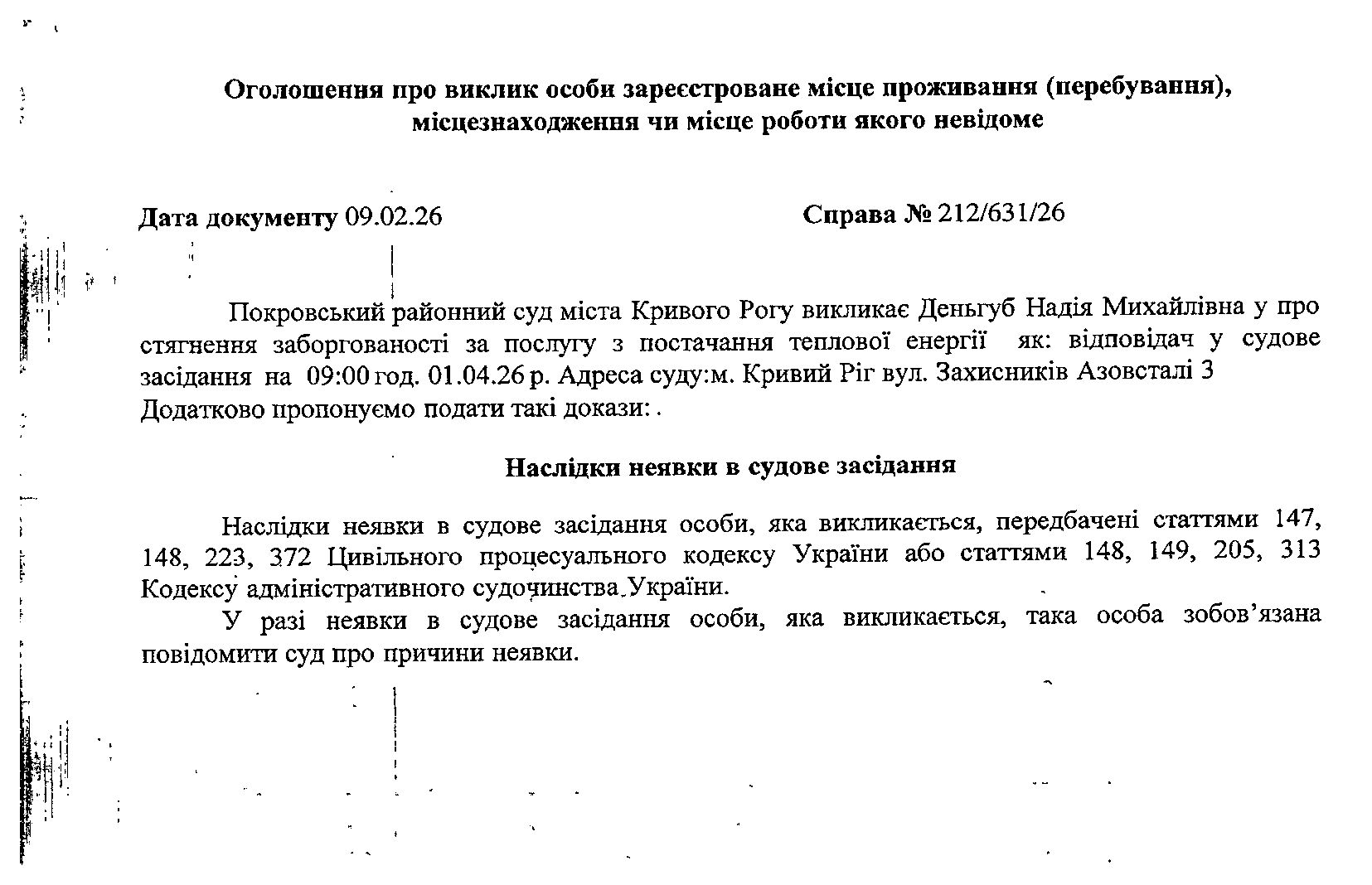 Оголошення про виклик до суду Деньгуб Надії Михайлівни