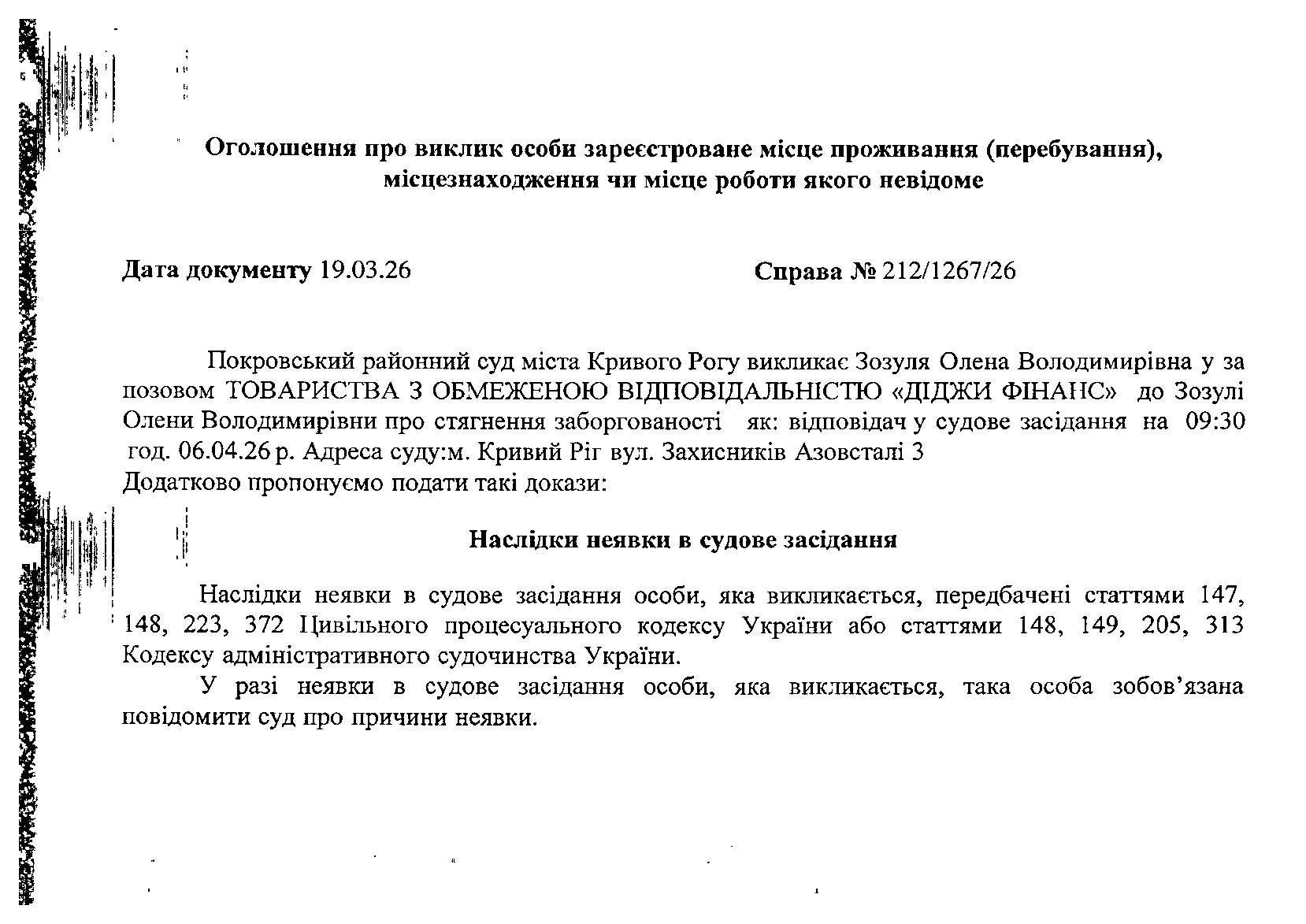 Оголошення про виклик до суду Зозулі Олени Володимирівни