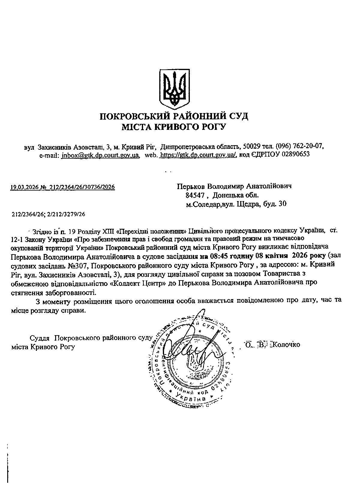 Оголошення про виклик до суду Перькова Володимира Анатолійовича