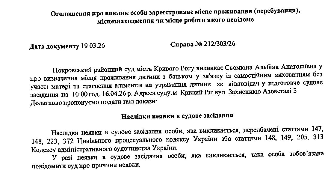 Оголошення про виклик до суду Сьомкіну Альбіну Анатоліївну