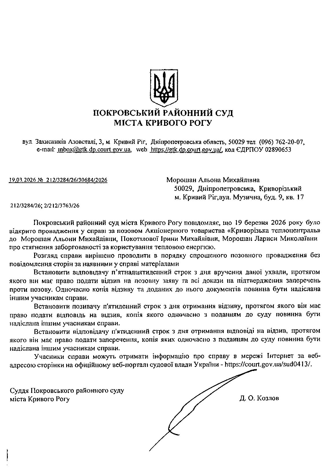 Оголошення про виклик до суду Морошан Альони Михайлівни