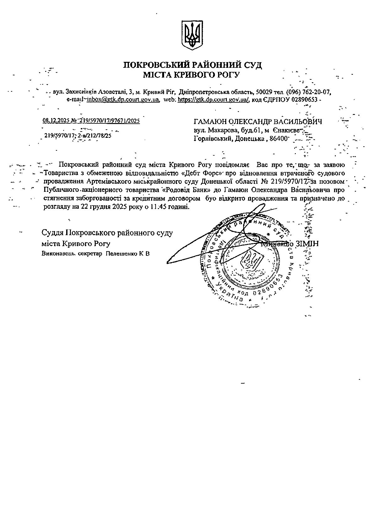 Оголошення про виклик до суду Гамаюна Олександра Васильовича