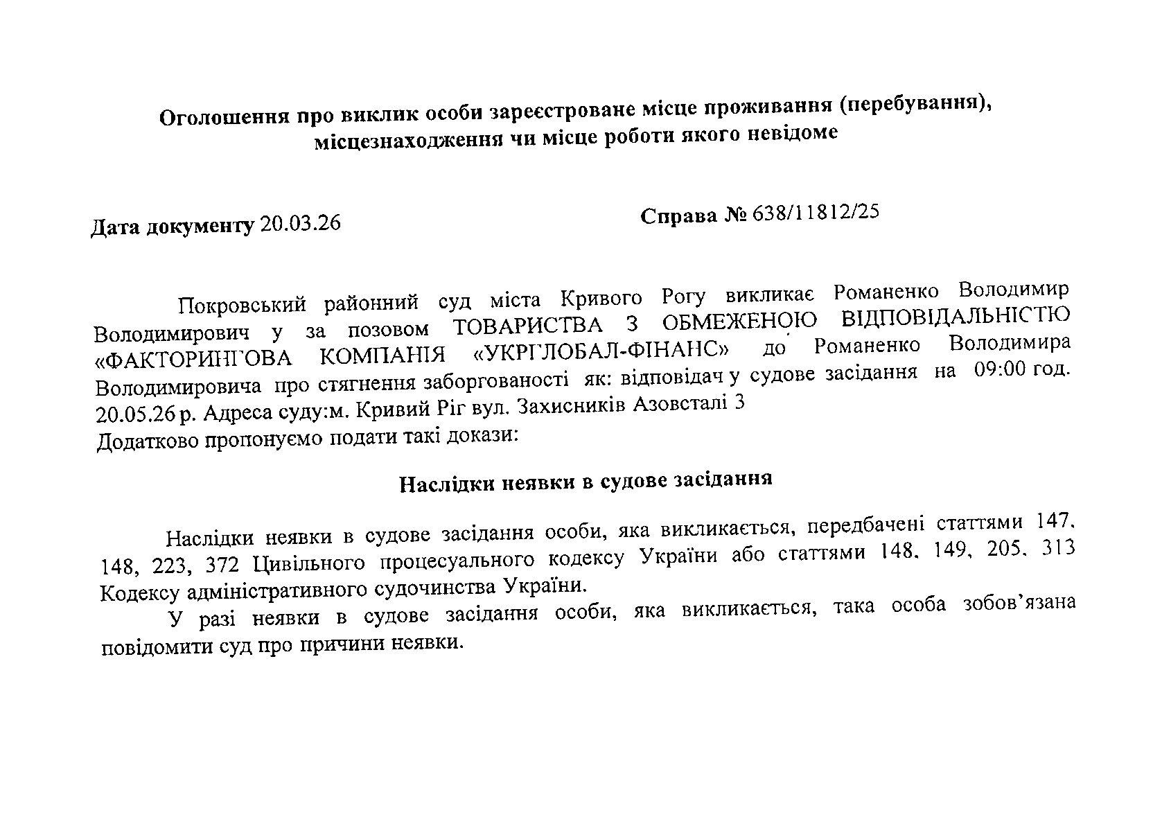 Оголошення про виклик до суду Романенка Володимира Володимировича