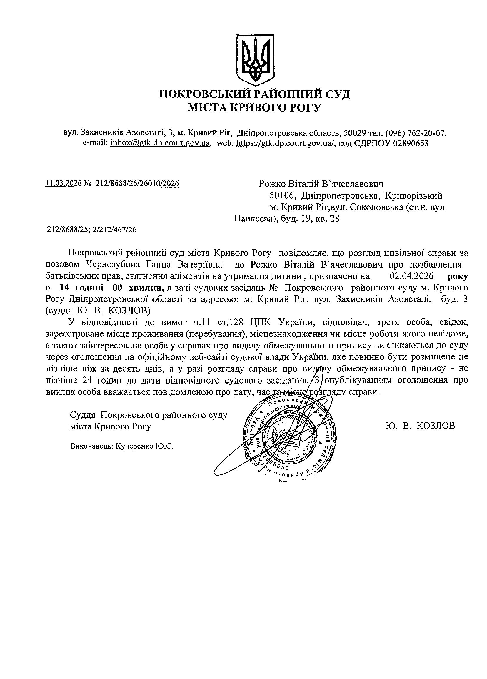 Оголошення про виклик до суду Рожка Віталія В'ячеславовича