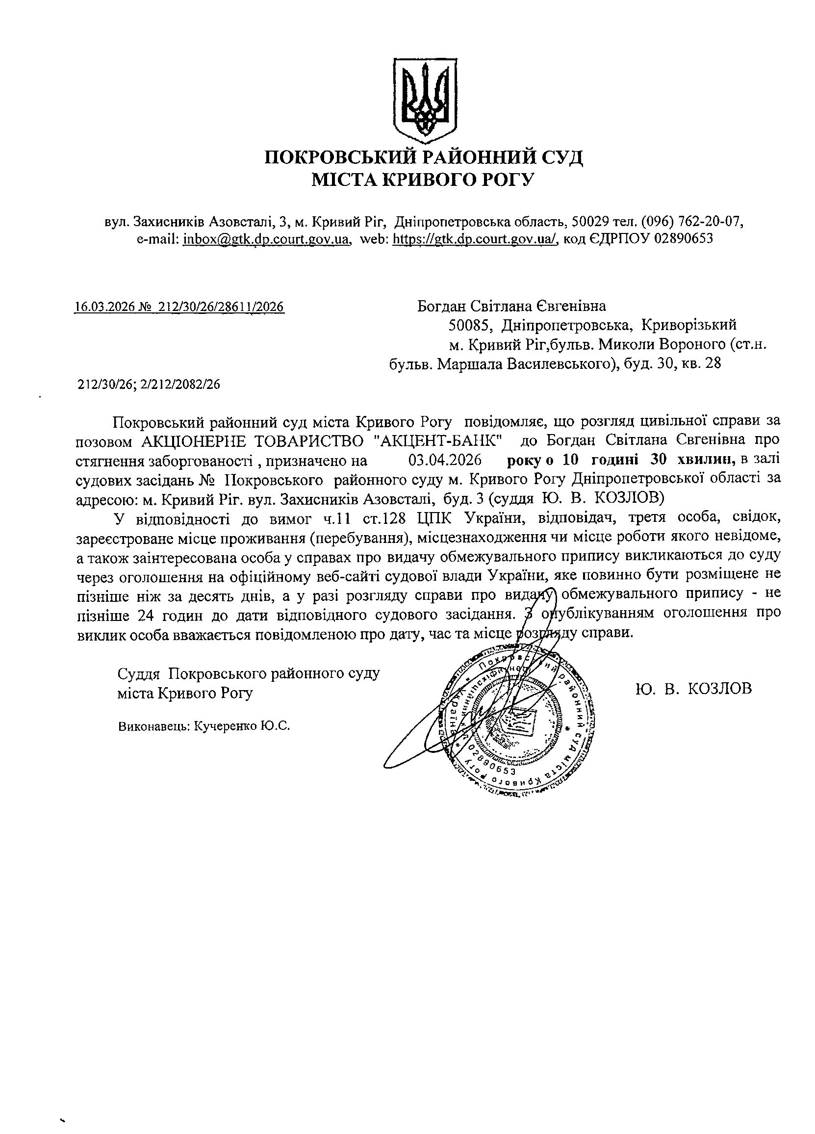 Оголошення про виклик до суду Богдан Світлани Євгенівни