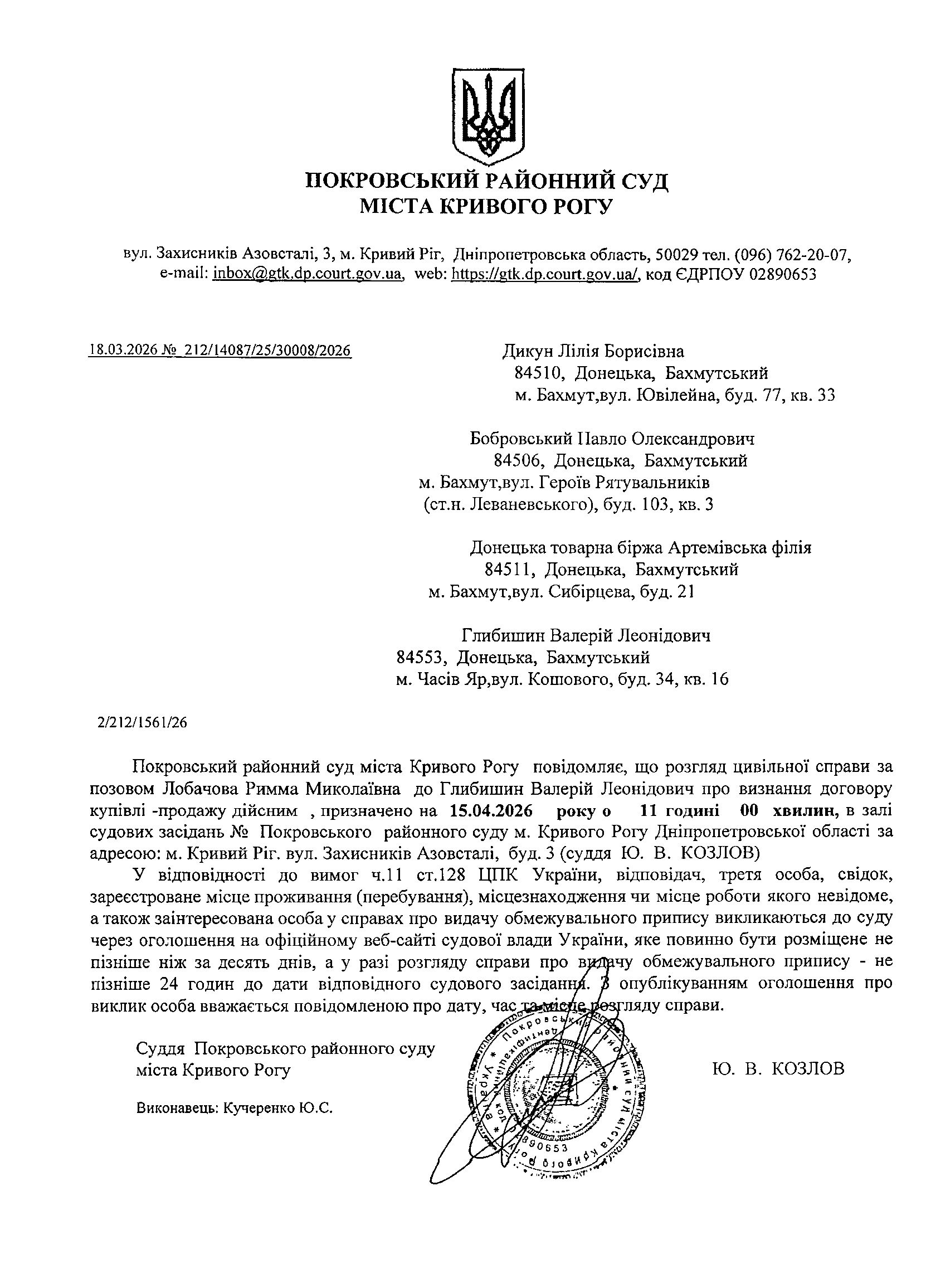 Оголошення про виклик до суду Дикун Лілії Борисівни, Бобровського Павла Олександровича, Глибишина Валерія Леонідовича