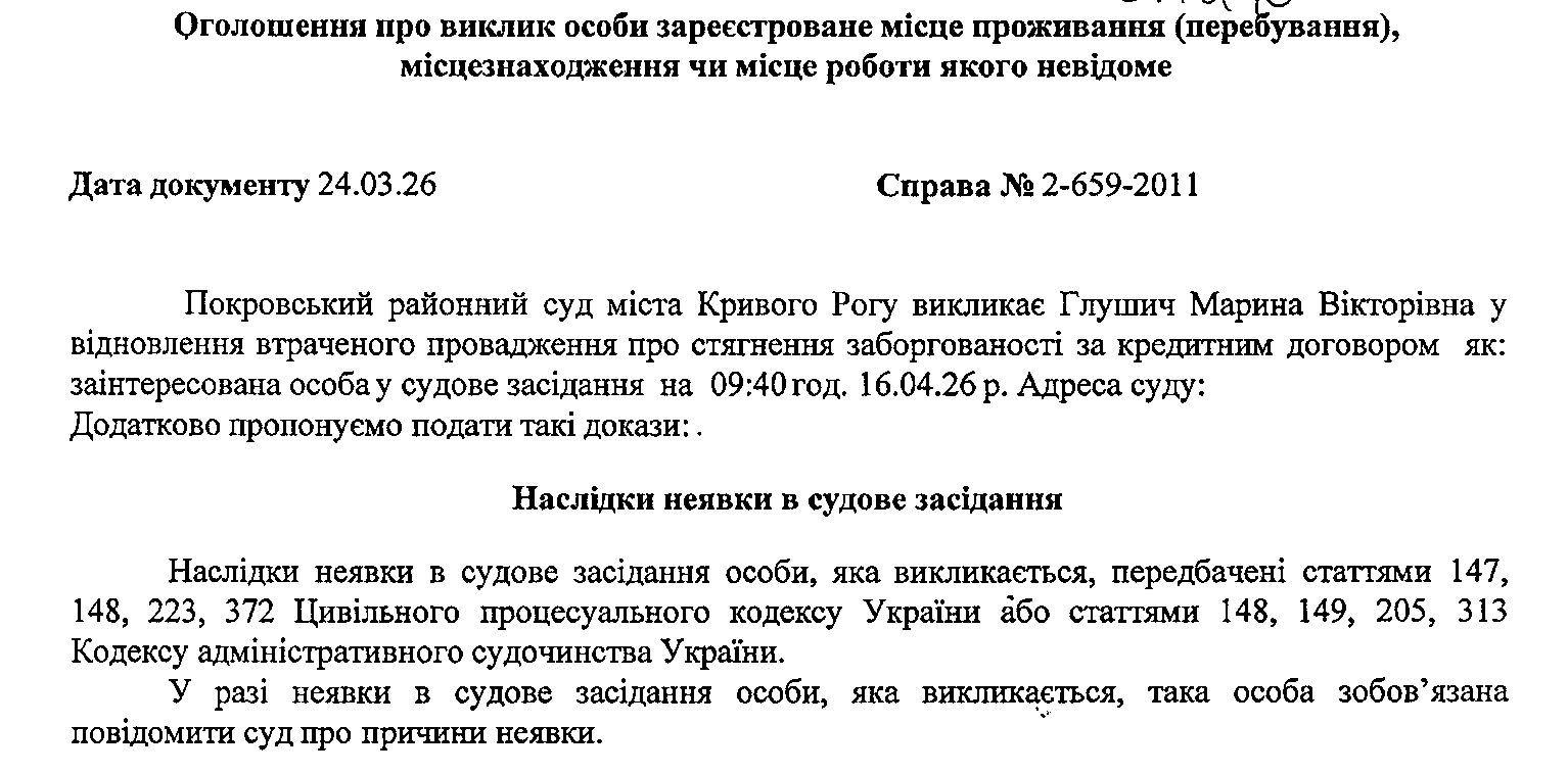 Оголошення про виклик до суду Глушич Марини Вікторівни