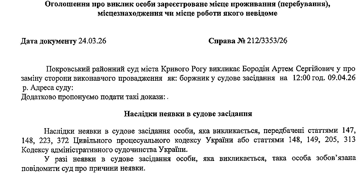 Оголошення про виклик до суду Бородіна Артема Сергійовича