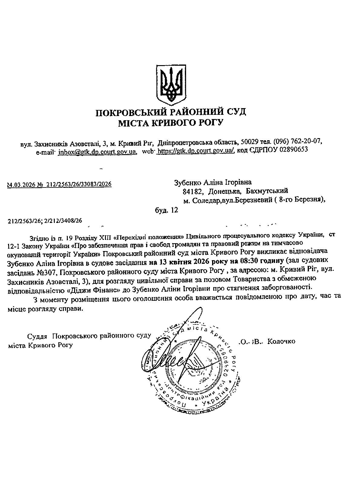 Оголошення про виклик до суду Зубенко Аліни Ігорівни