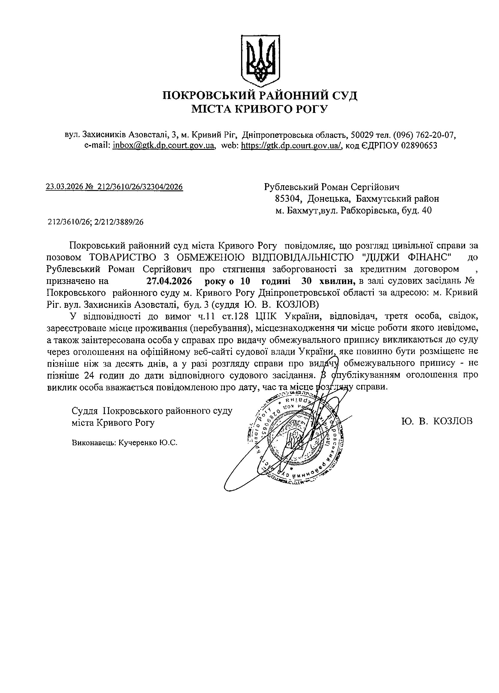 Оголошення про виклик до суду Рублевського Романа Сергійовича