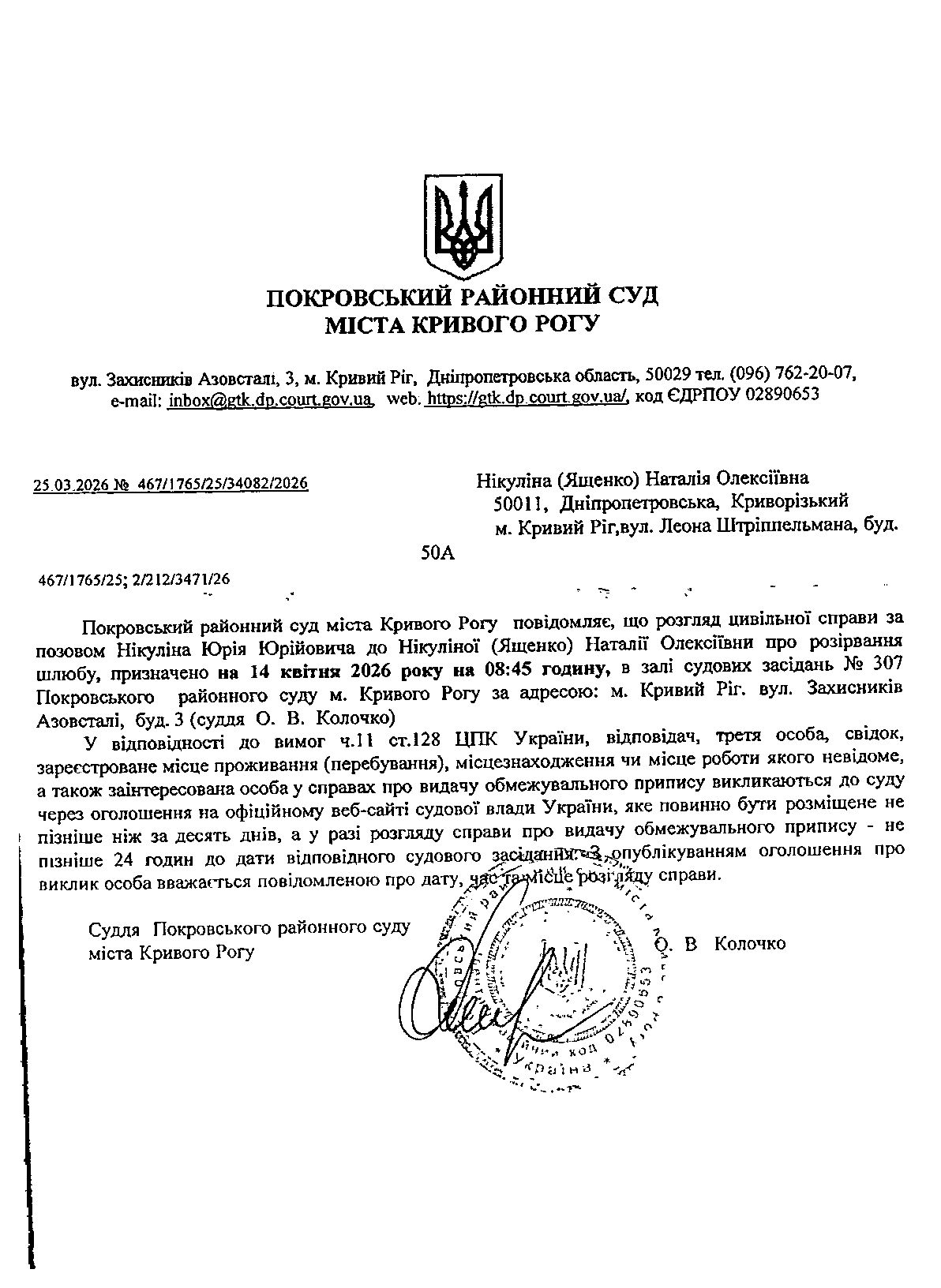 Оголошення про виклик до суду Нікуліної (Ященко) Наталії Олексіївни