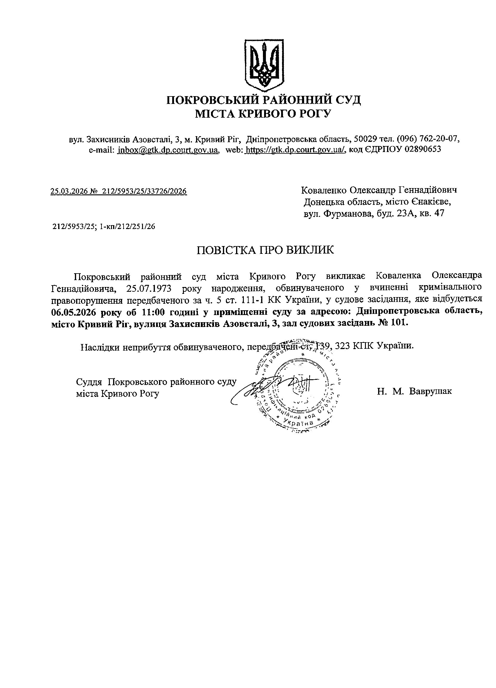 Оголошення про виклик до суду Коваленка Олександра Геннадійовича