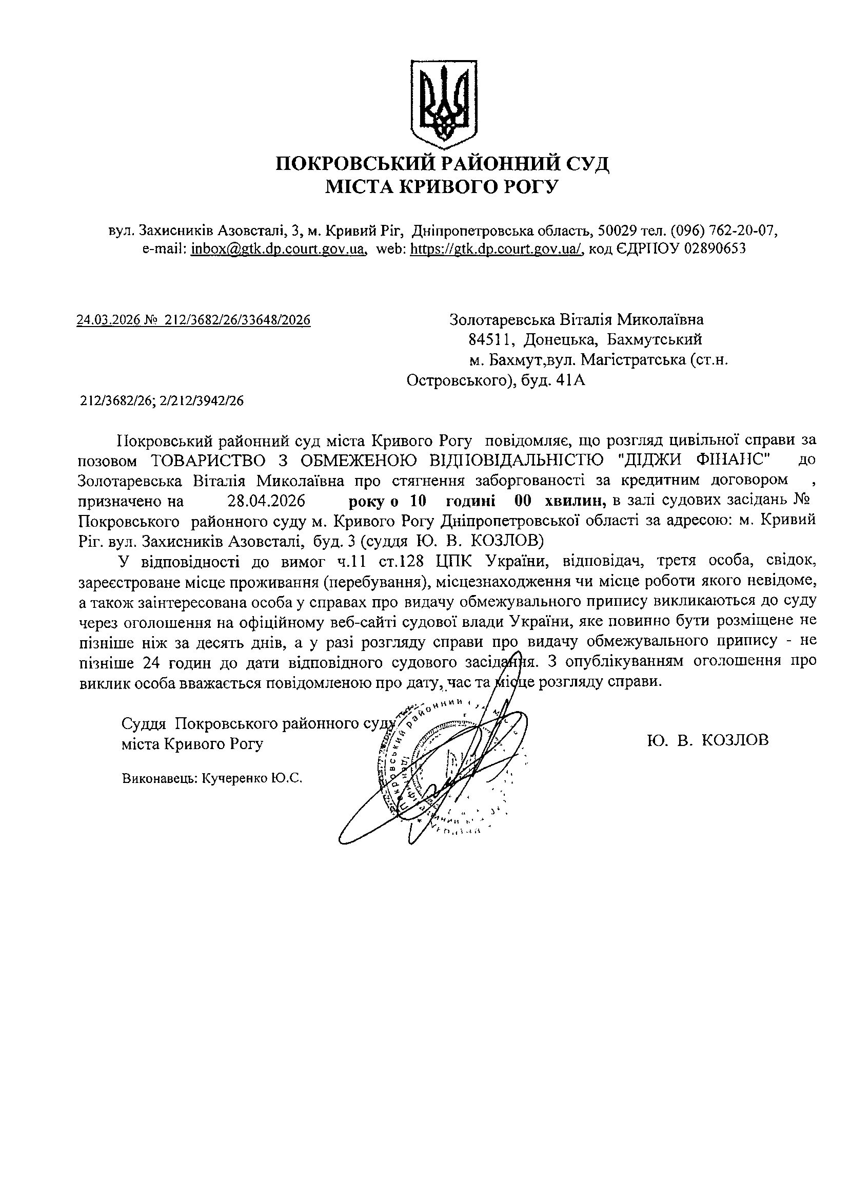 Оголошення про виклик до суду Золотаревської Віталії Миколаївни