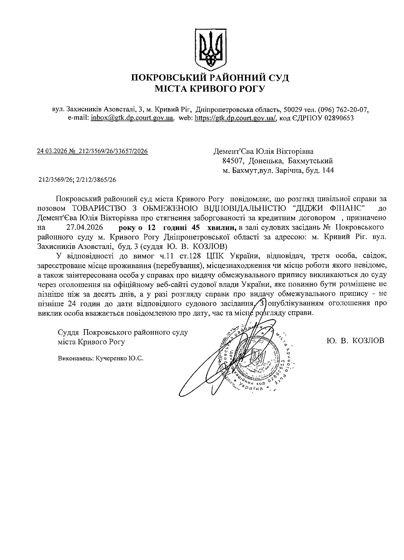 Оголошення про виклик до суду Демент'євої Юлії Вікторівни