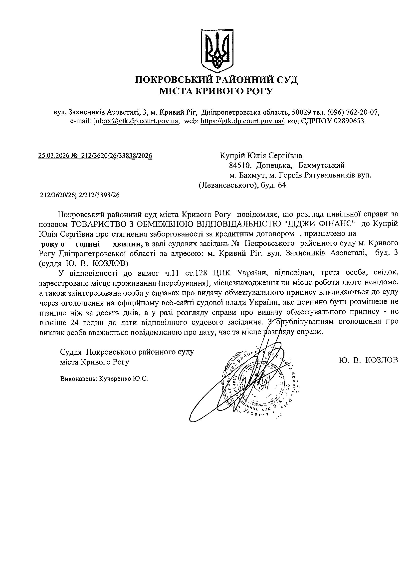 Оголошення про виклик до суду Купрій Юлії Сергіївни