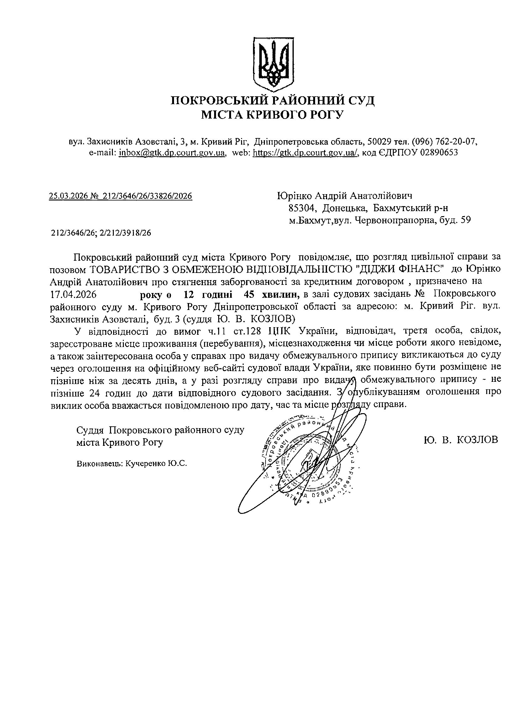 Оголошення про виклик до суду Юрінко Андрія Анатолійовича