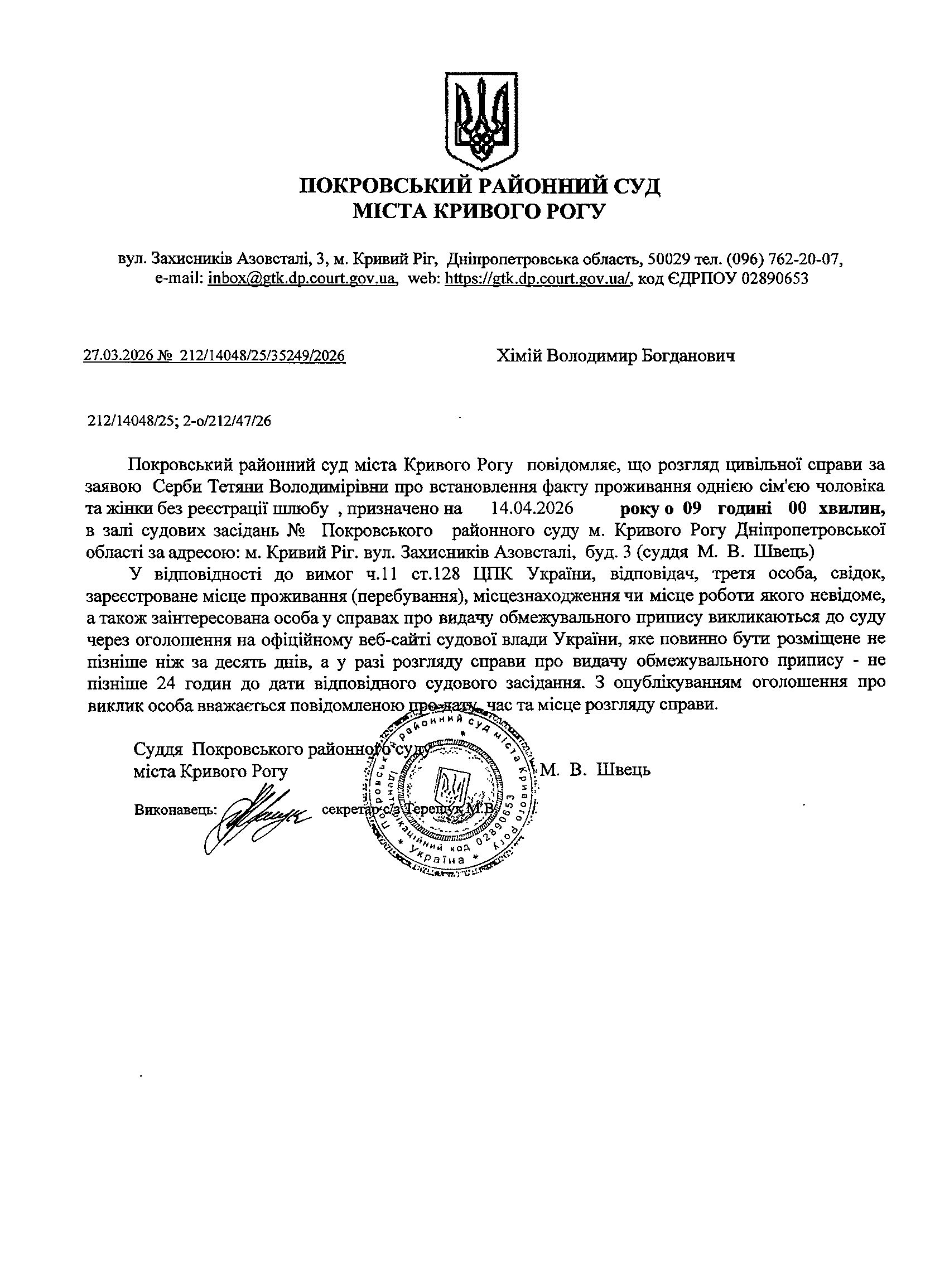 Оголошення про виклик до суду Хімія Володимира Боглановича