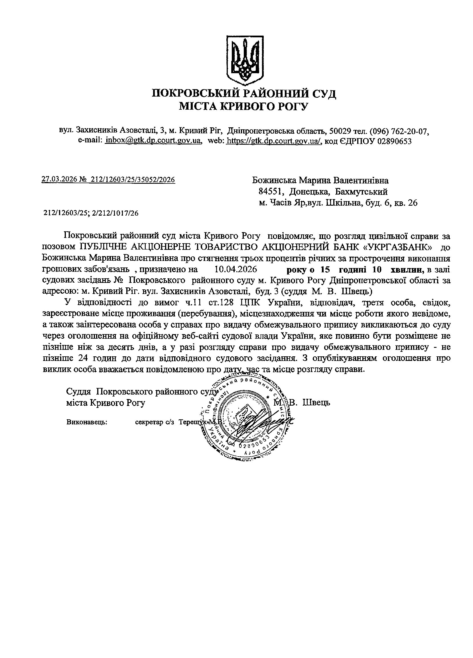 Оголошення про виклик до суду Божинської Марини Валентинівни