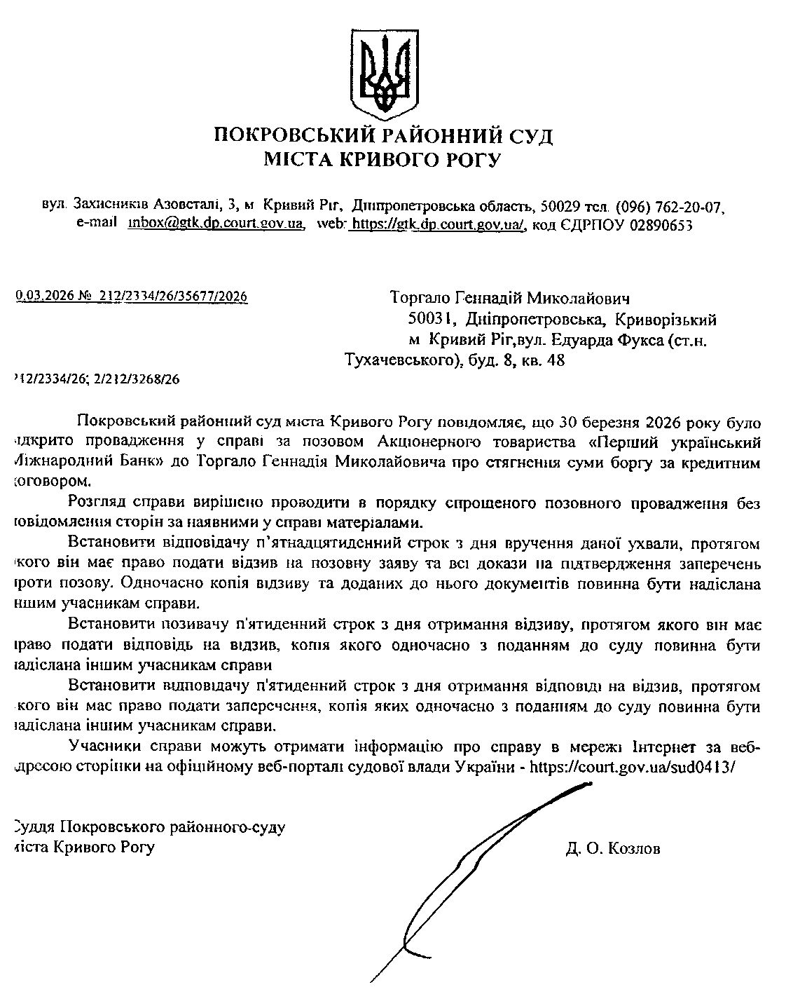 Оголошення про виклик до суду Торгала Геннадія Миколайовича