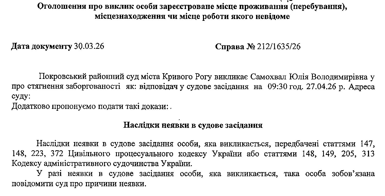 Оголошення про виклик до суду Самохвал Юлії Володимирівни