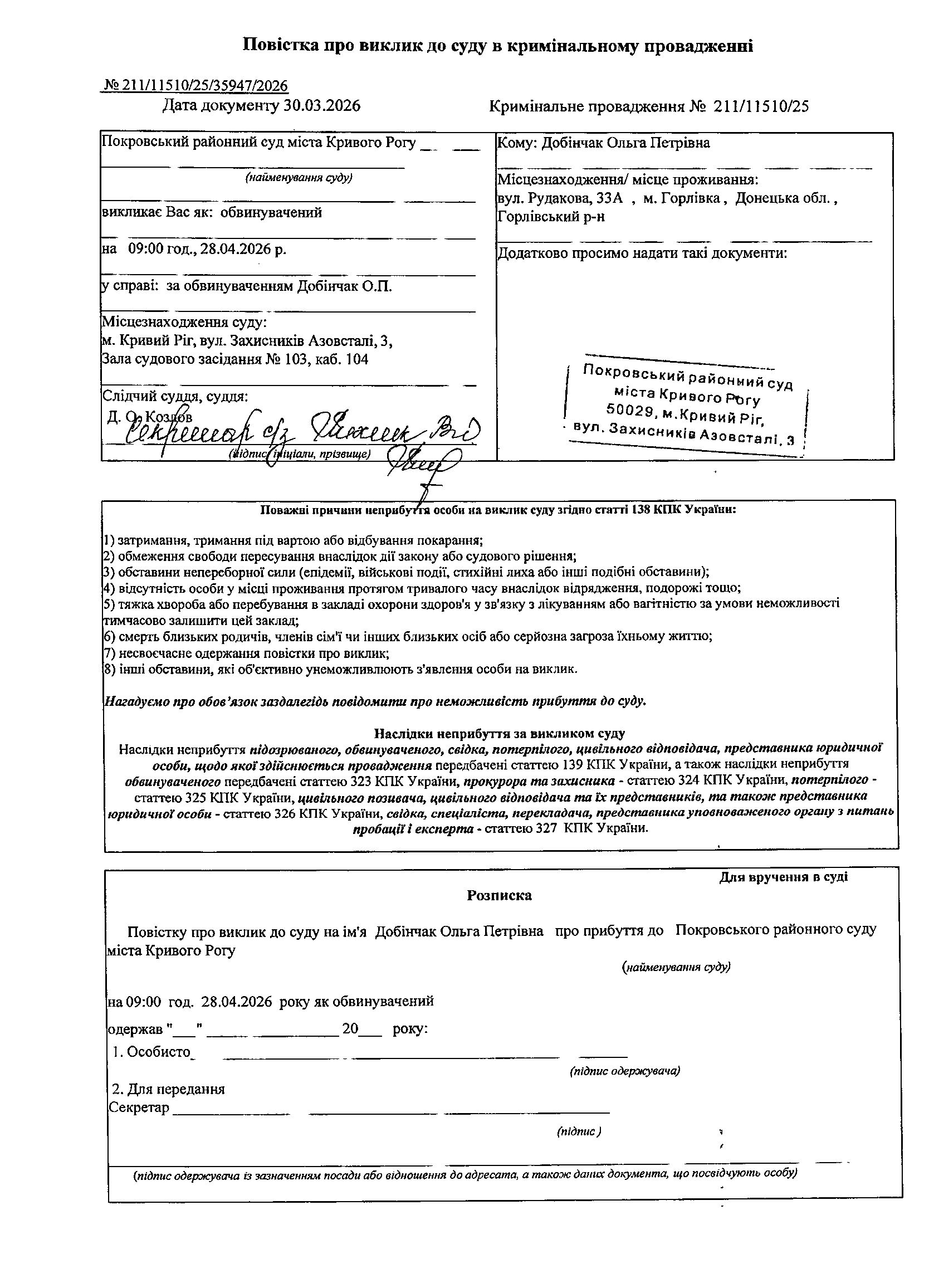 Оголошення про виклик до суду Добінчак Ольги Петрівни