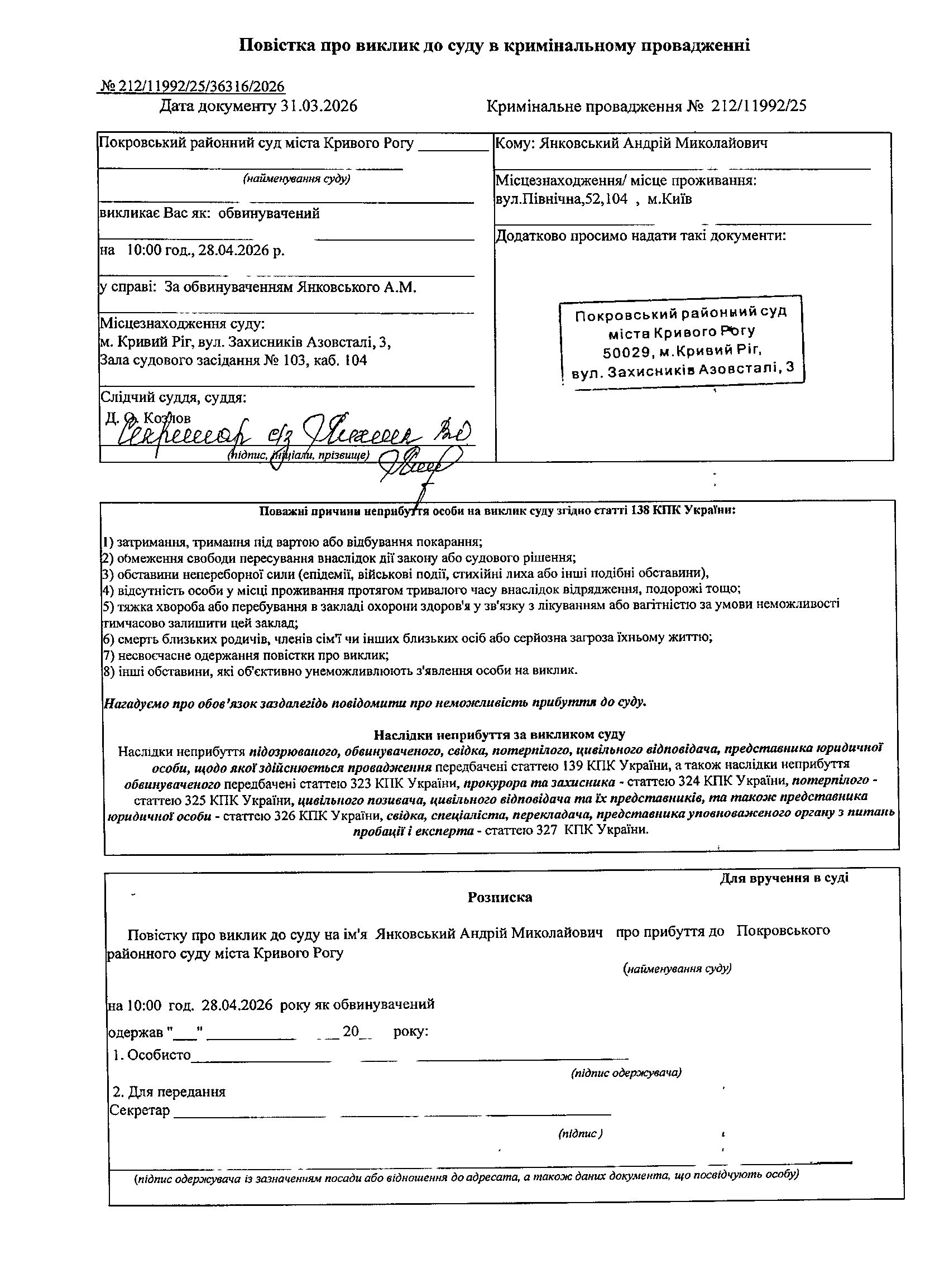 Оголошення про виклик до суду Янковськовського Андрія Миколайовича