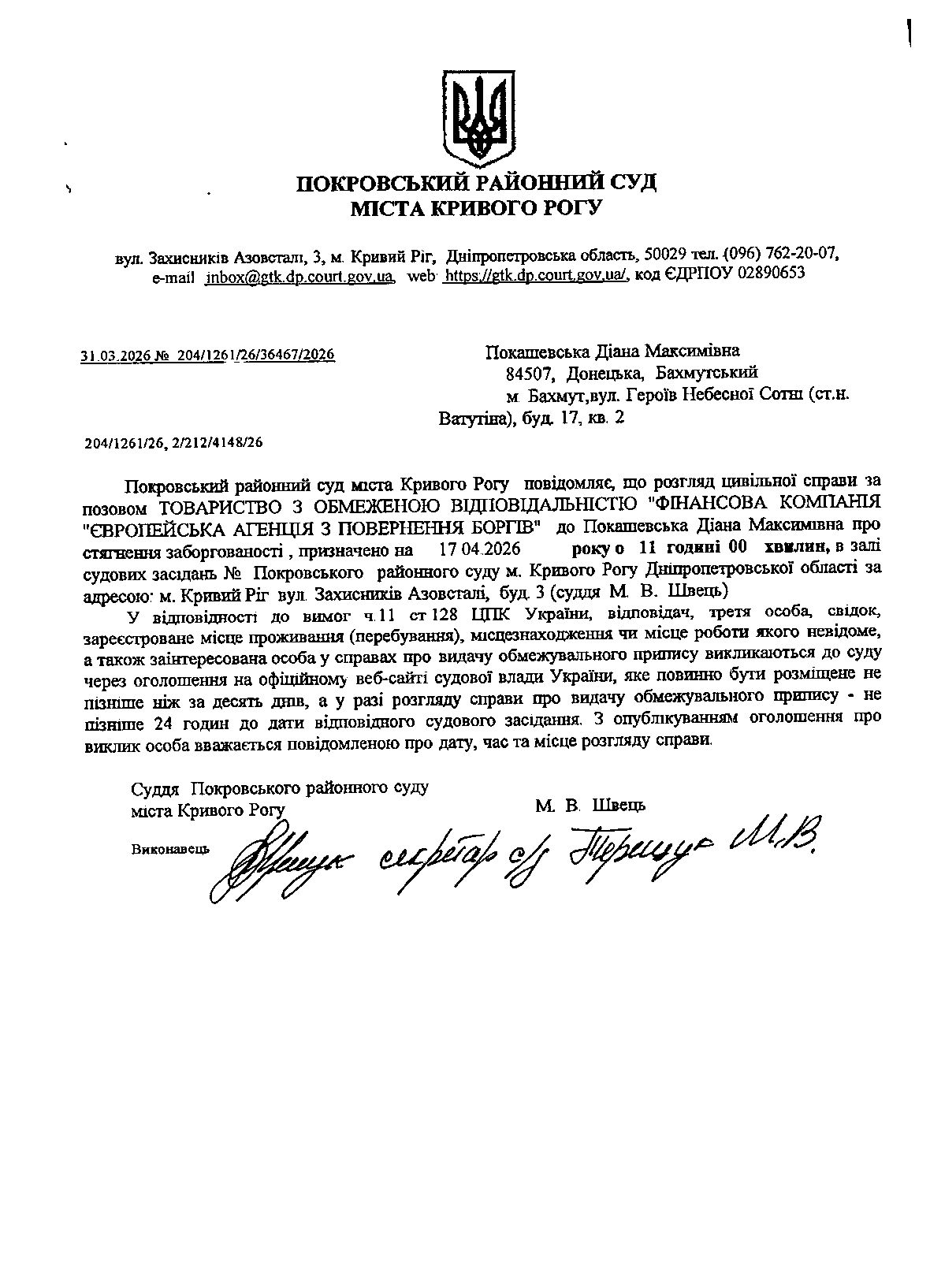 Оголошення про виклик до суду Покашевської Діани Максимівни