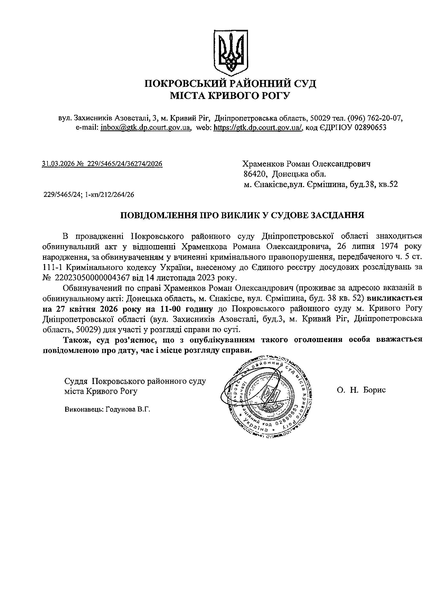 Оголошення про виклик до суду Храменкова Романа Олександровича