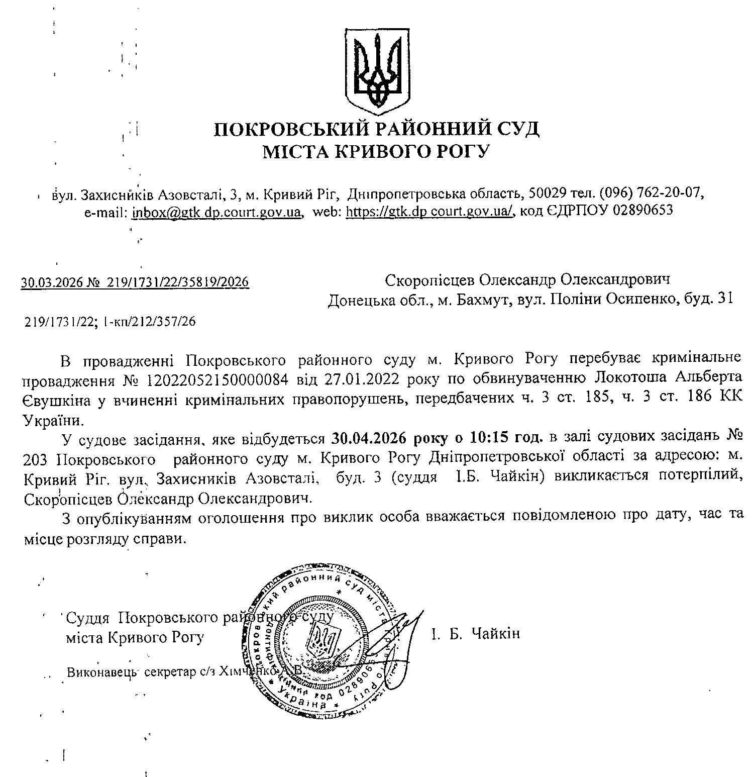 Оголошення про виклик до суду Скоропісцева Олександра Олександровича