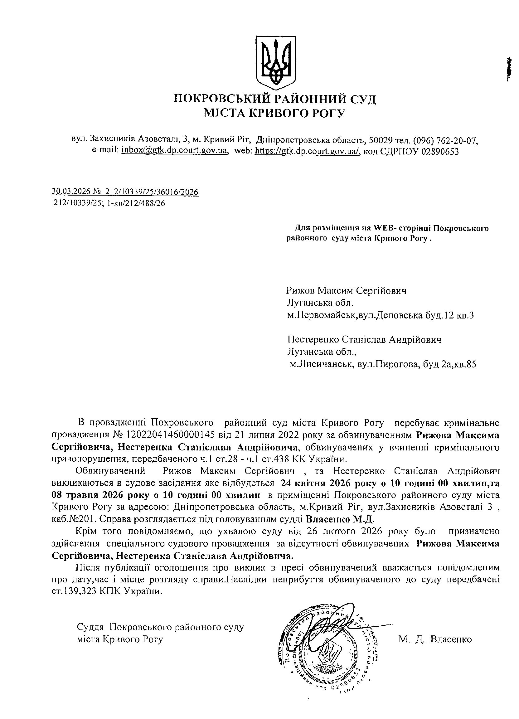 Оголошення про виклик до суду Рижова Максима Сергійовича, Нестеренка Станіслава Андрійовича