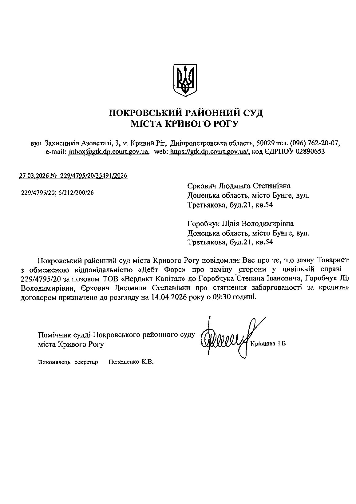 Оголошення про виклик до суду Єркович Людмили Степанівни, Горобчук Лідії Степанівни