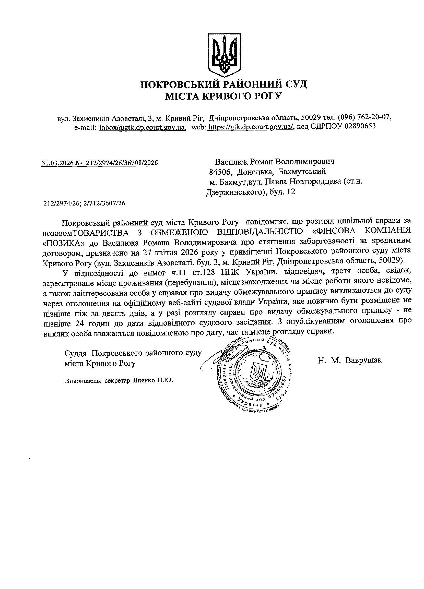 Оголошення про виклик до суду Василюка Романа Володимировича