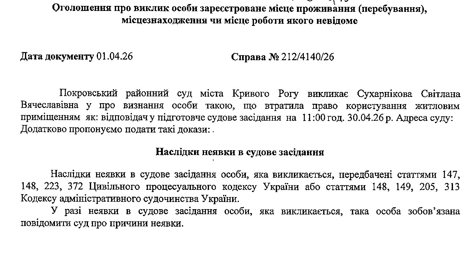 Оголошення про виклик до суду Сухарнікової Світлани Вячеславівни