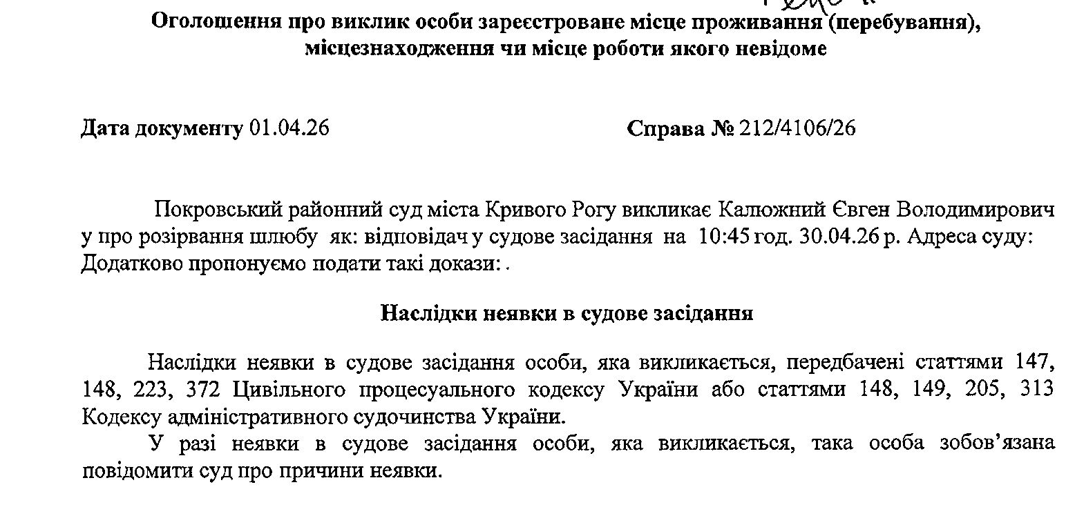 Оголошення про виклик до суду Калюжного Євгена Володимировича