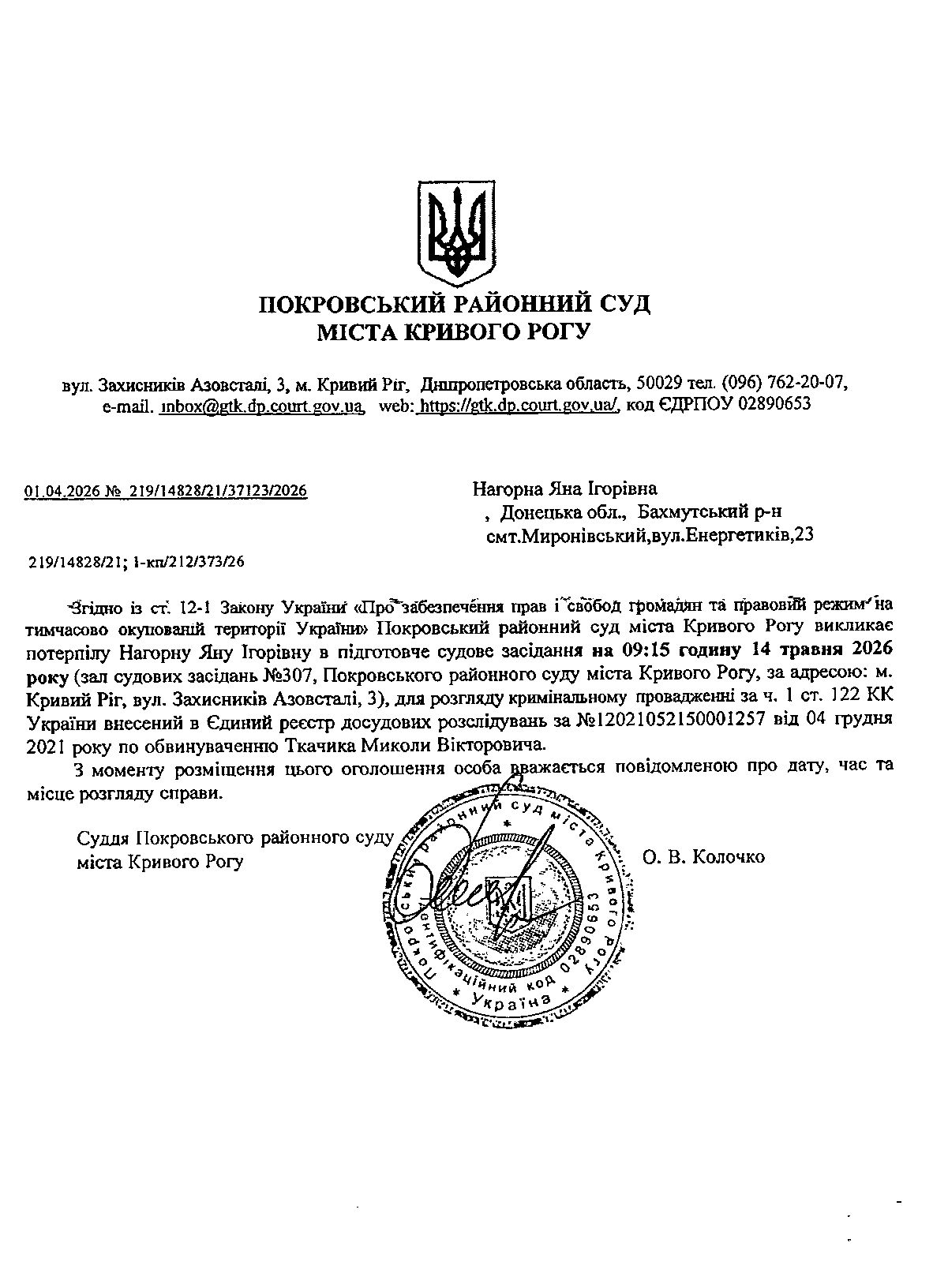 Оголошення про виклик до суду Нагорної Яни Ігорівни