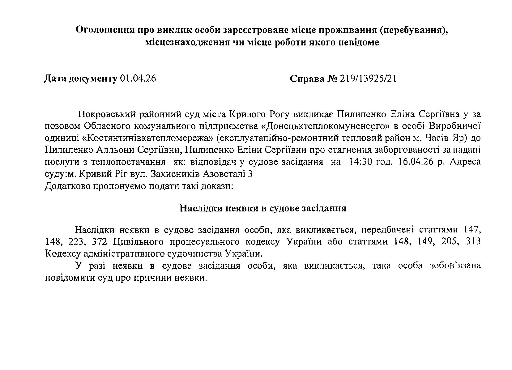 Оголошення про виклик до суду Пилипенко Еліни Сергіївни